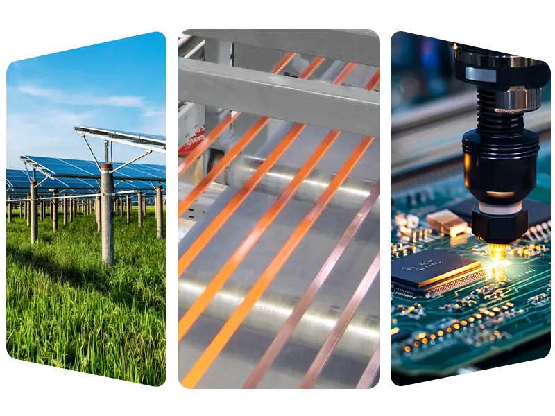 • Campu fotovoltaicu: pruduzzione di massa di nastri di saldatura fotovoltaica è busbars per aiutà i cumpunenti à cunduce l'electricità in modu efficiente.